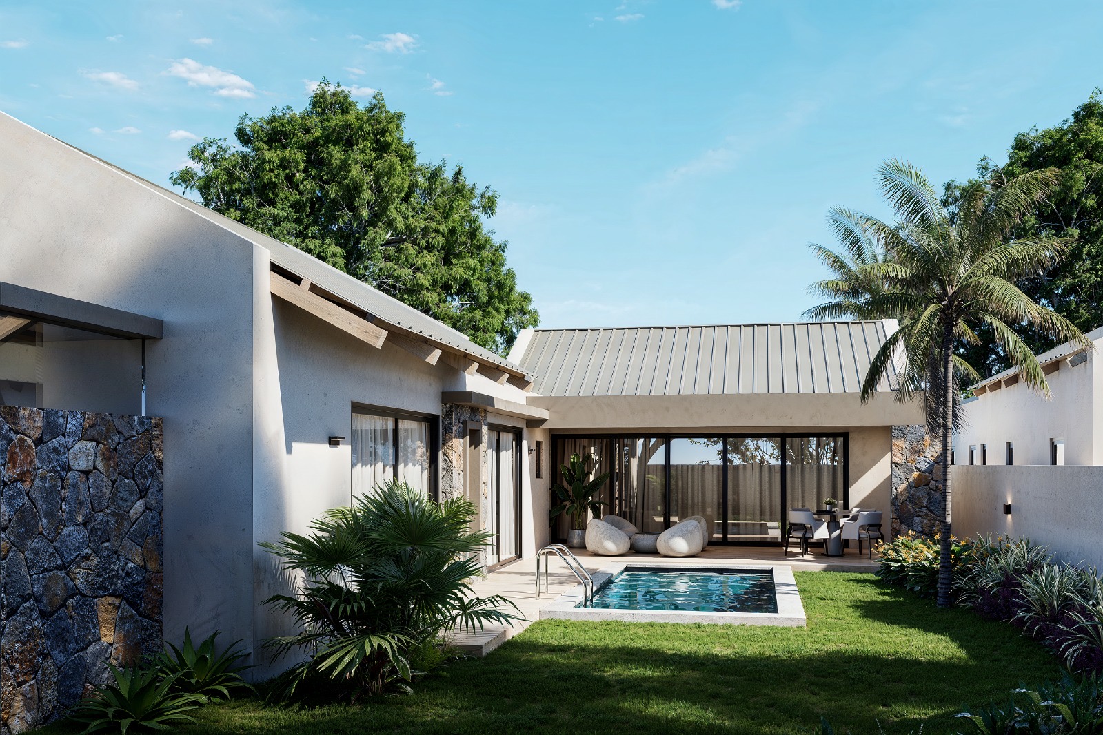 A refined trio of modern residence with private pools and stone finishes, perfectly situated for ultimate privacy in the north of Mauritius